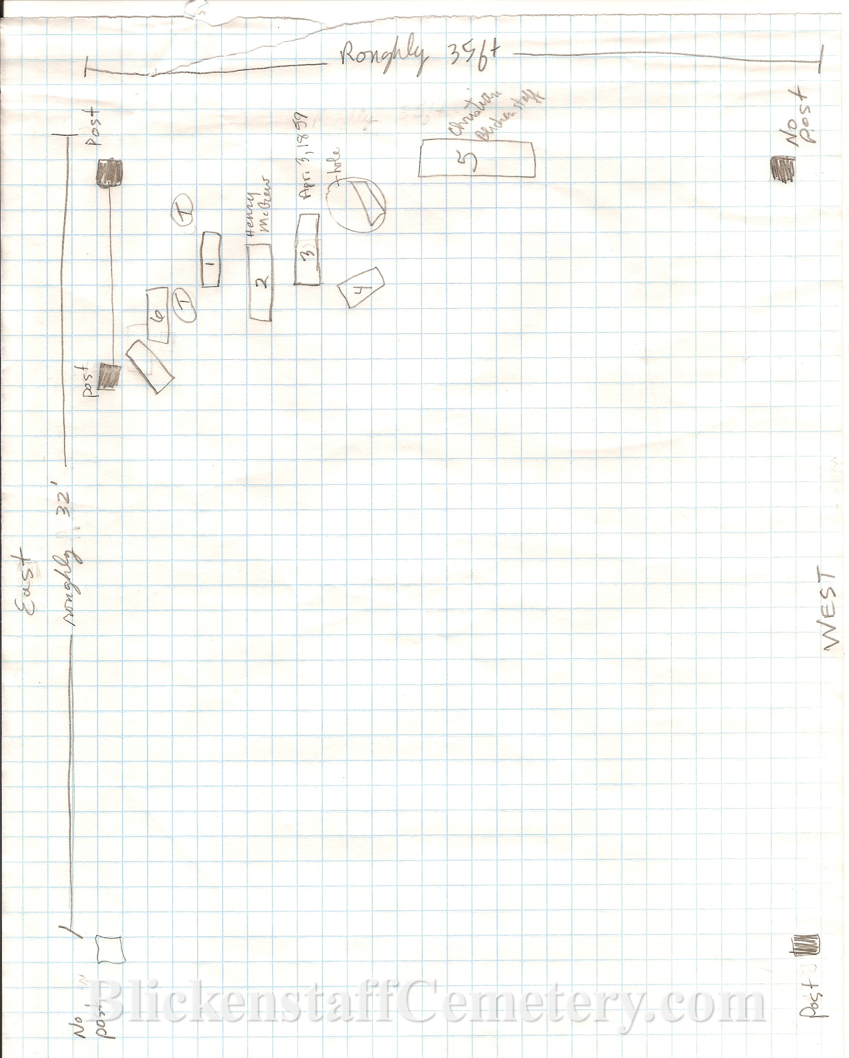 corner posts were still standing marking corners of an area approximately 35 feet square (although the cemetery deed appears