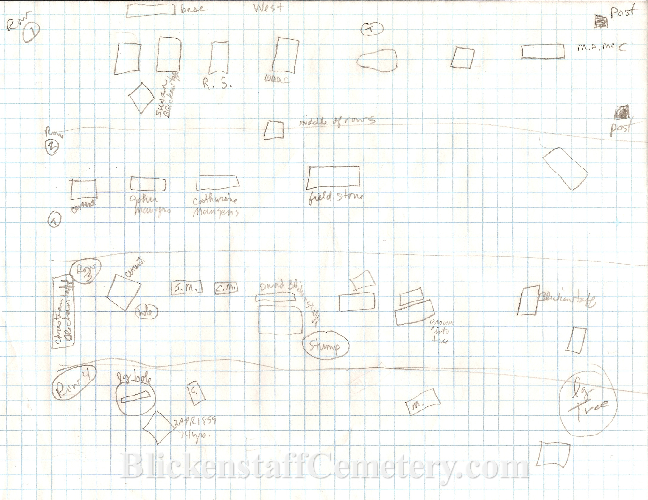 BLICKENSTAFF, Mary (maiden name CRULL) wife of Jacob died 2-19-1862, age ____ (stone not yet located but likely buried in this row or row 2)